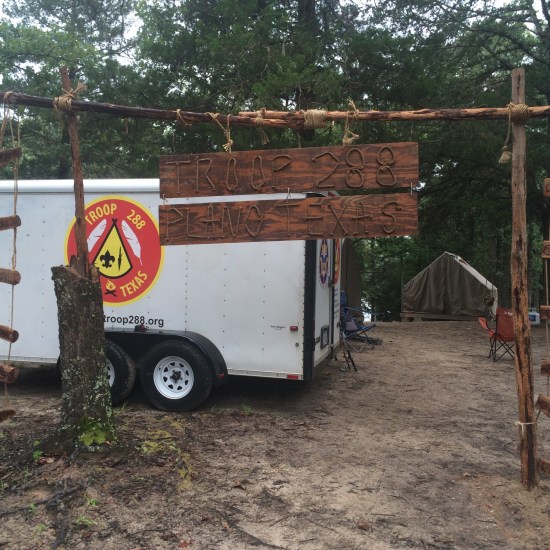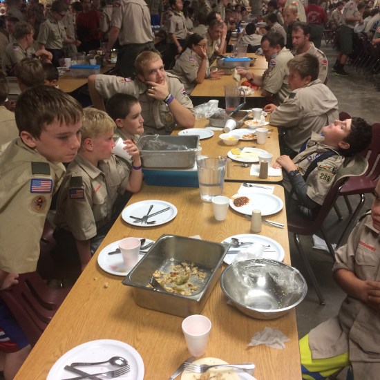 No camp update would be complete without some color commentary on the camp food. The menu has included chicken fried meat “product”, pot roast that was slightly better than the CFS, and tonight was chicken fajitas that actually tasted like chicken fajitas. The meals are served family style so all the boys make their own plates. This is a change compared to past camps where the boys were served each portion by standing in a serving line which I think is more efficient, less wasteful, and far less messy. After each meal the dining hall looks like a Golden Corral on a Saturday night. There is an optional salad bar that does offer both scouts and adults some more options. The boys seemed to be enjoying the food, but part of me thinks they are still thinking about the churros they had for desert tonight.